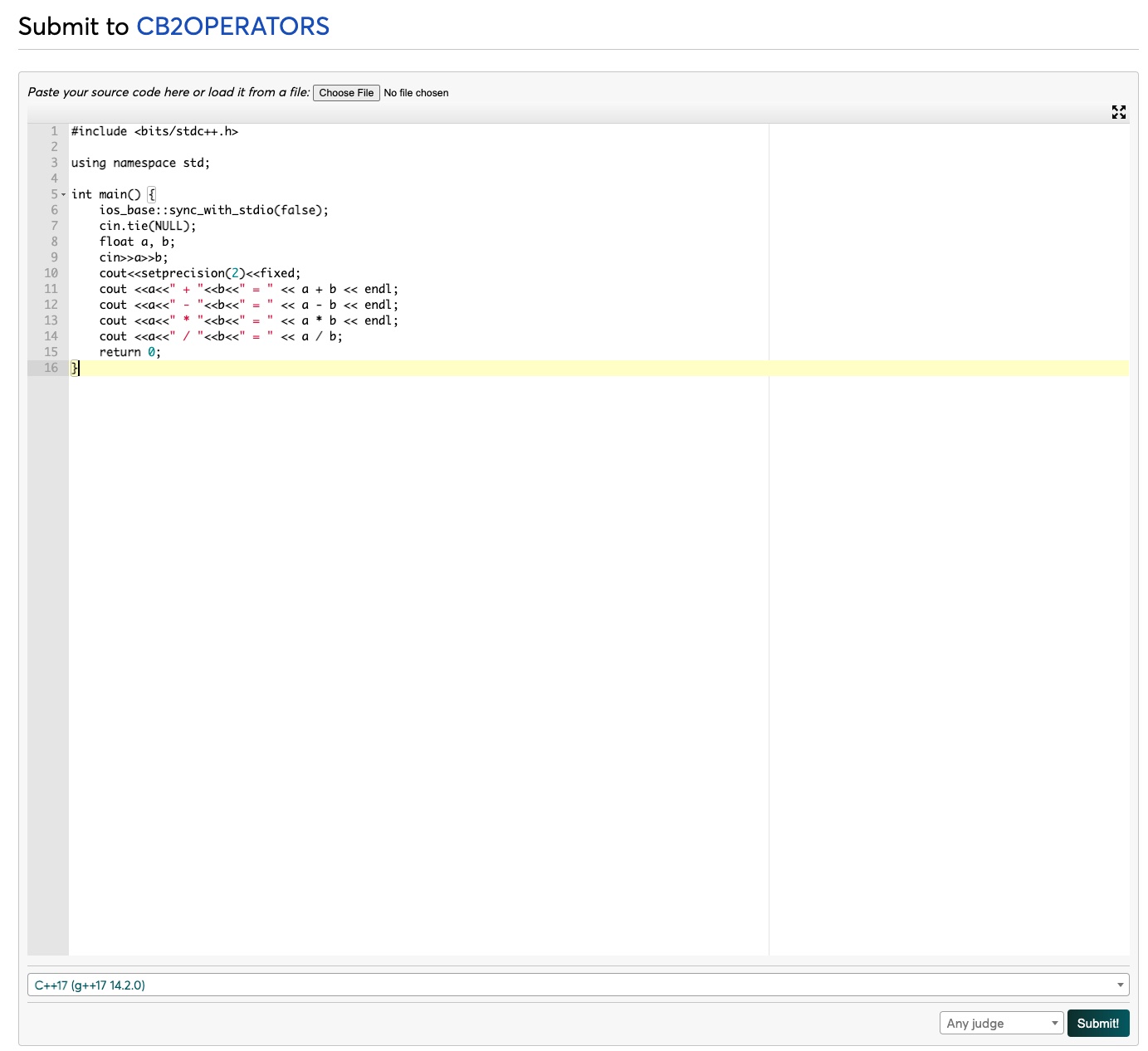 Dán nội dung Mã nguồn vào ô mã nguồn hoặc chọn nộp qua file ==> Chọn ngôn ngữ lập trình (C++) ==> Submit